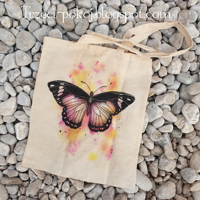 ...Torby z kropkowanymi motylami przeznaczyłam na eksperyment z nowymi farbami (te farby akwarelowe do tkanin czekały już bardzo długo).I wouldn't have decorated them but for the fact that I 'destroyed' some of my previous project. I spilt some ink from my marker by accident and some ugly dots appeared... I was upset at first (I had to paint everything from scratch).